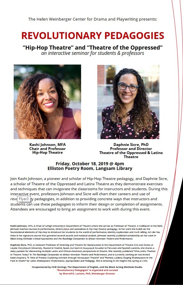 Join Kashi Johnson, a pioneer and scholar of Hip-Hop Theatre pedagogy, and Daphnie Sicre, a scholar of Theatre of the Oppressed and Latinx theatre as they demonstrate exercises and techniques that can invigorate the classrooms for instructors and students. During this interactive event, professors Johnson and Sicre will chart their careers and use of revolutionary pedagogies, in addition to providing concrete ways that instructors and students can use these pedagogies to inform their design or completion of assignments. Attendees are encouraged to bring an assignment to work with during this event.
